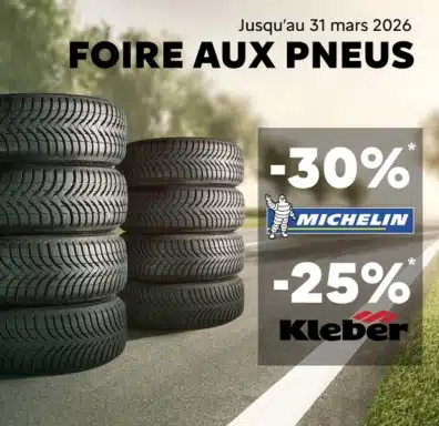 Pour rouler en tout serenité, profitez de -30%* sur vos pneus MICHELIN et -25%* sur pneus KLEBER jusqu’au 31 mars 2026.